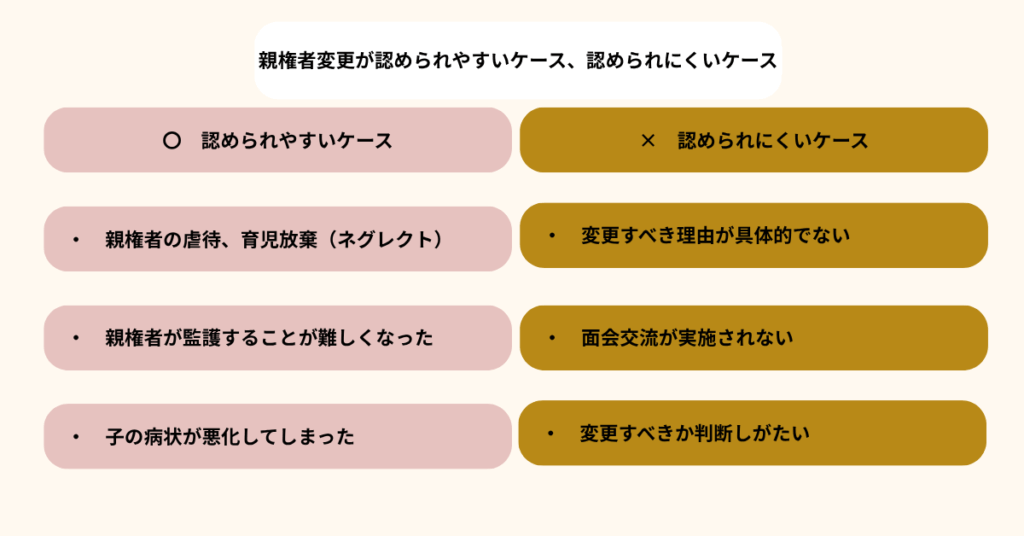 ここまで裁判所の判断基準を見てきましたが、親権者変更が認められやすいケース、認められにくいケースを見ていきましょう。